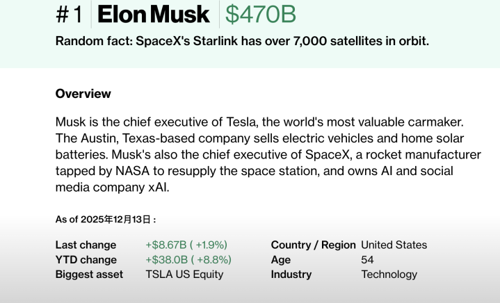 得益于特斯拉股价飙升,2021年10月马斯克的个人财富突破3000亿美元,成为统计史上最富有的人,一年后身家达到4000亿美元。马斯克目前持有特斯拉约13%的股份,是最大个人股东。据彭博财富指数,马斯克目前身家约为4700亿美元。